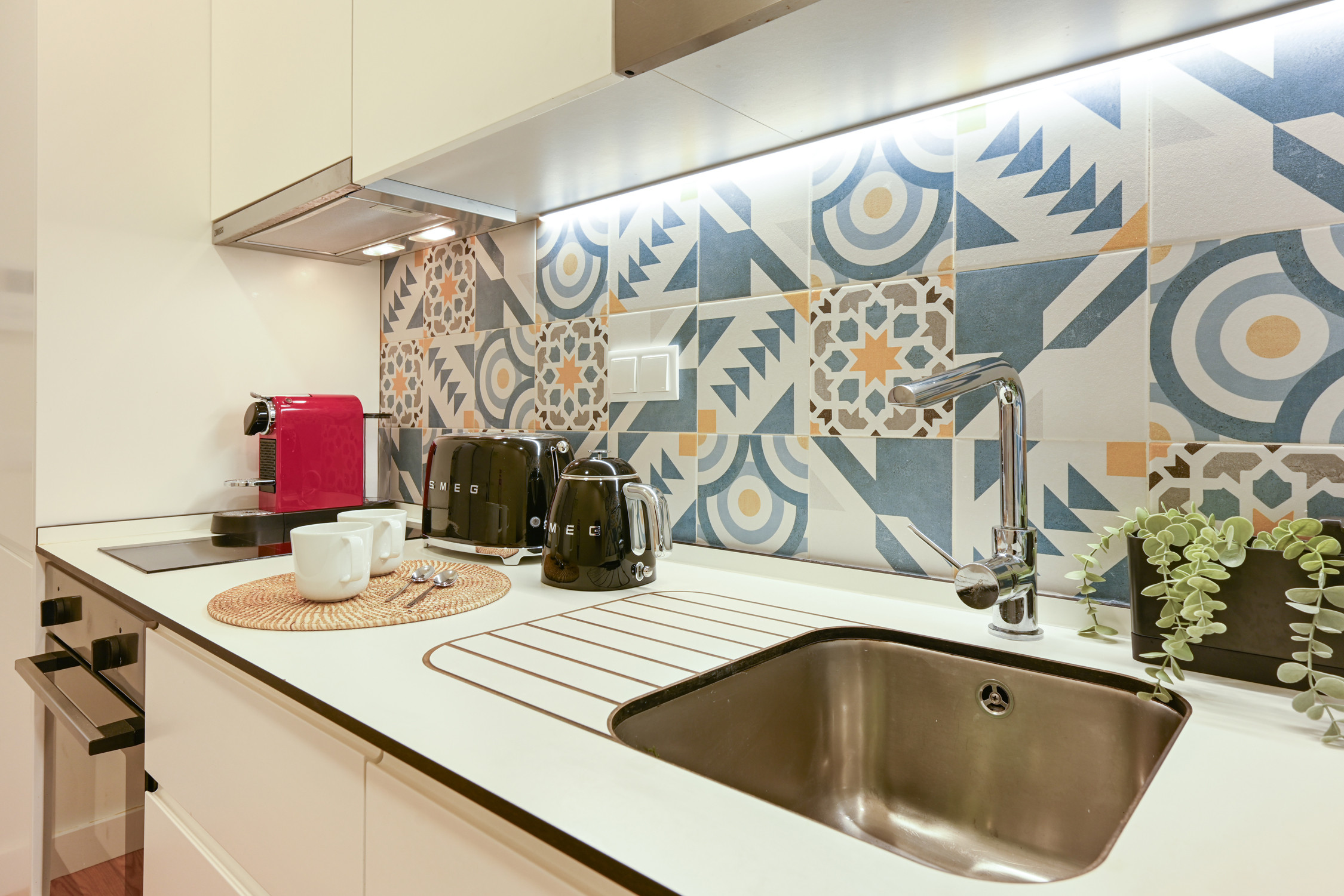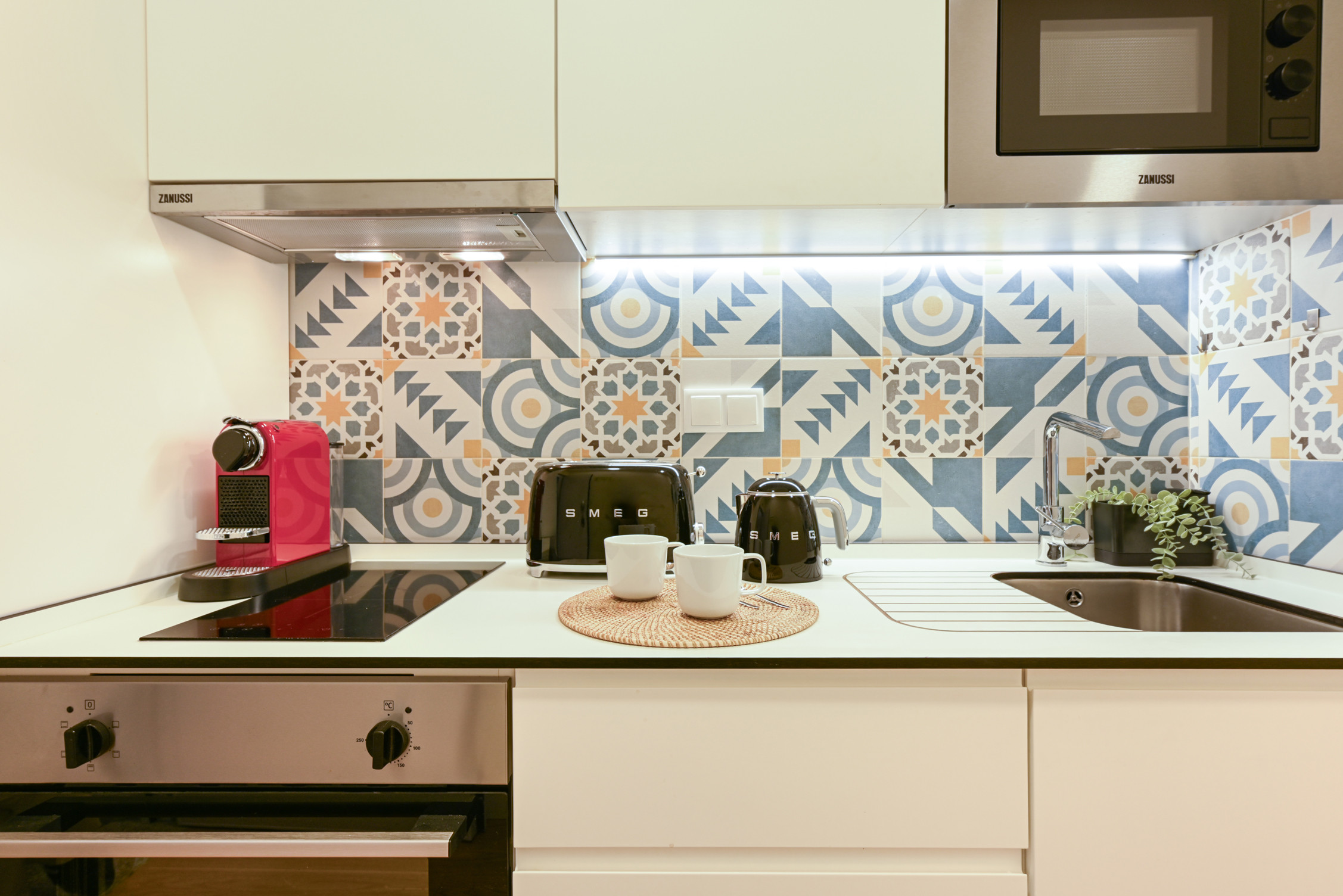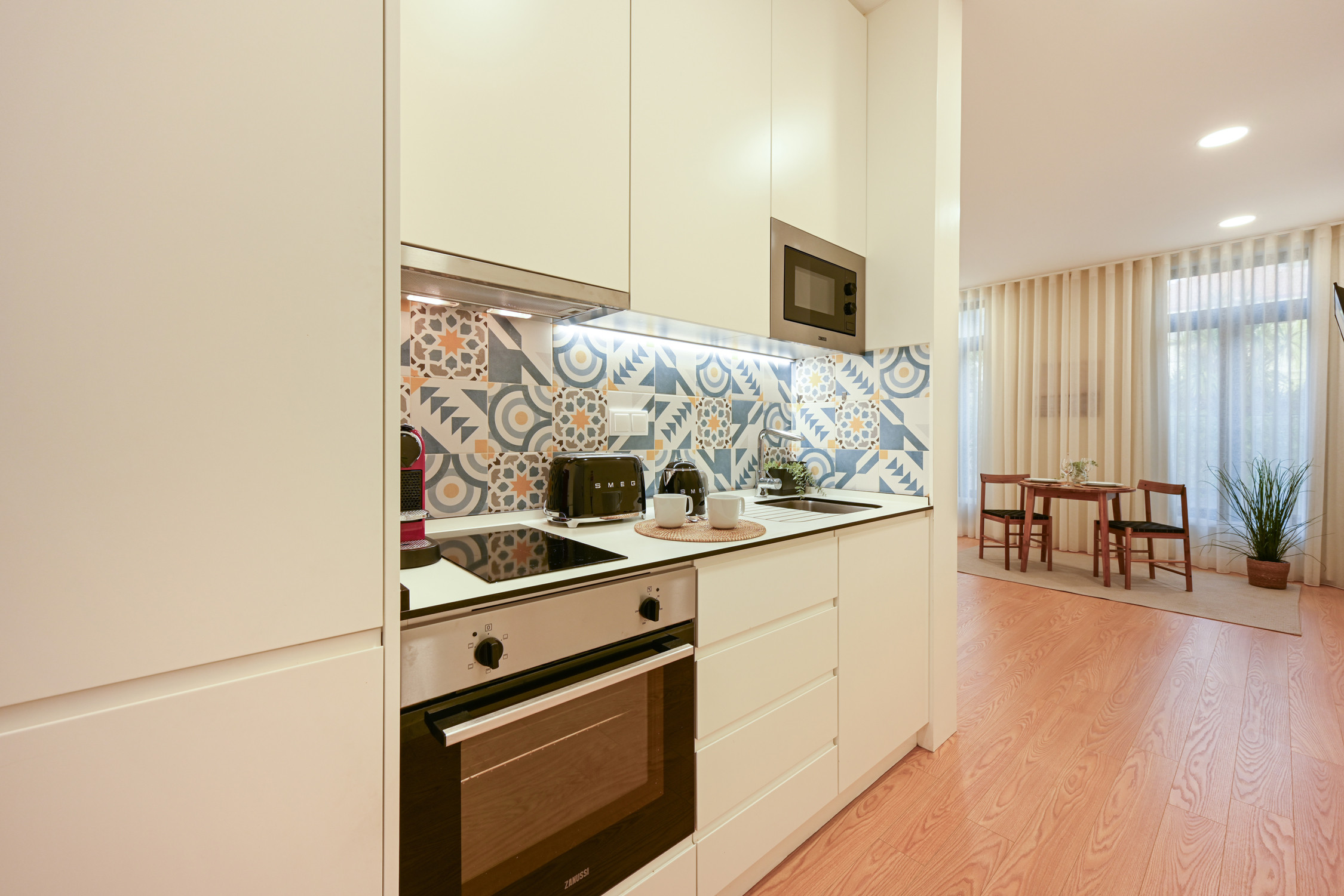 Kitchenette: Fully equipped with state-of-the-art appliances (hob, oven, fridge and coffee machine), seamlessly integrated into the dining space.