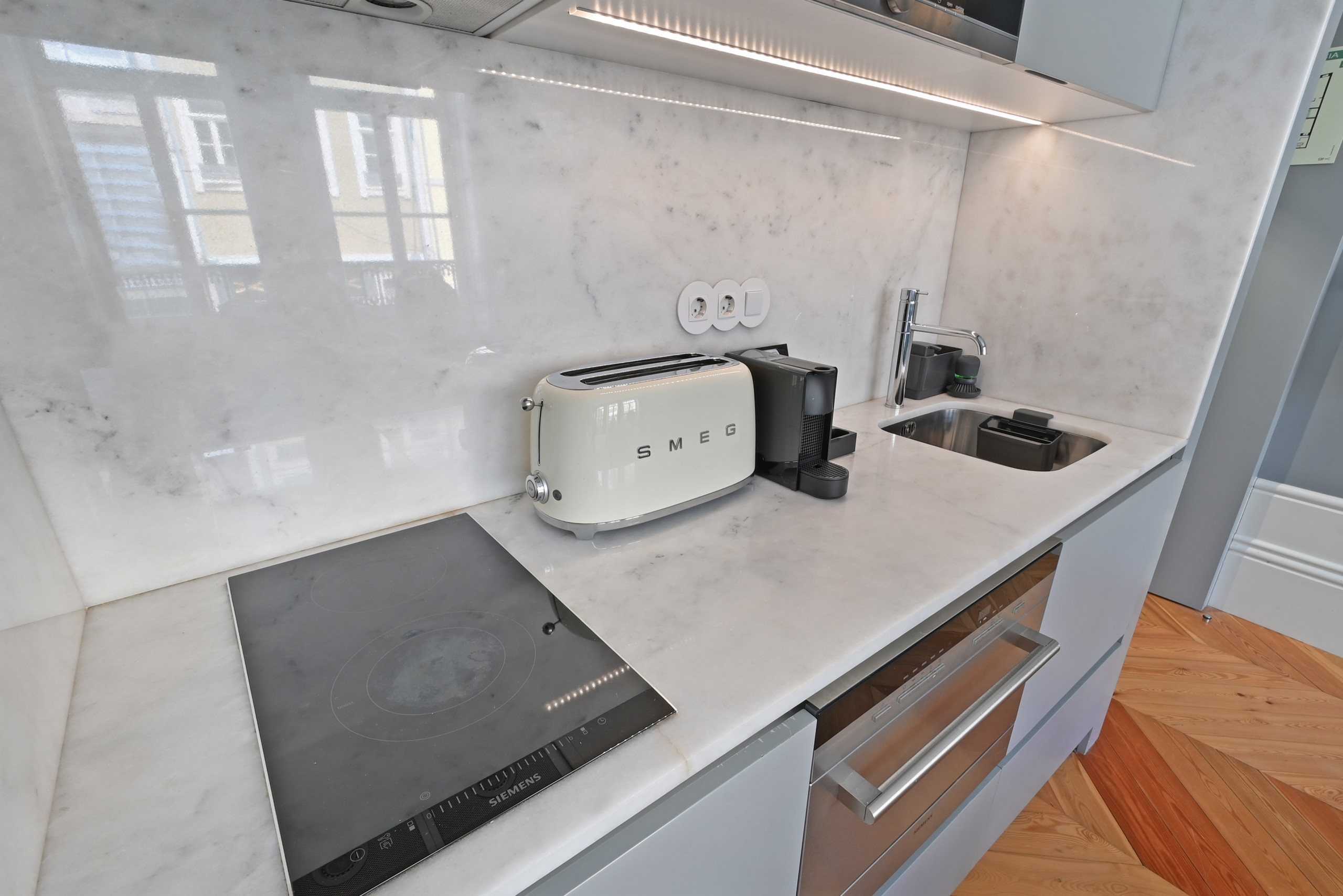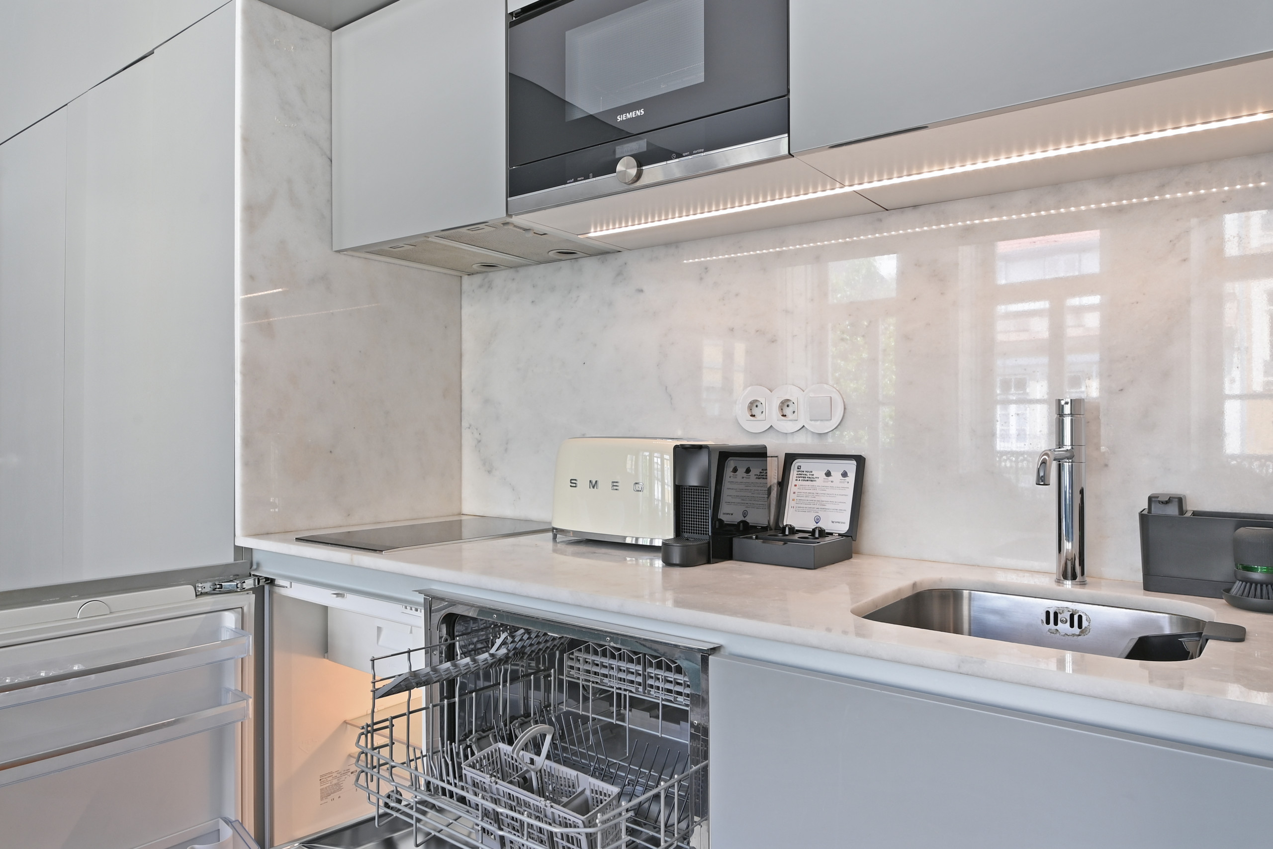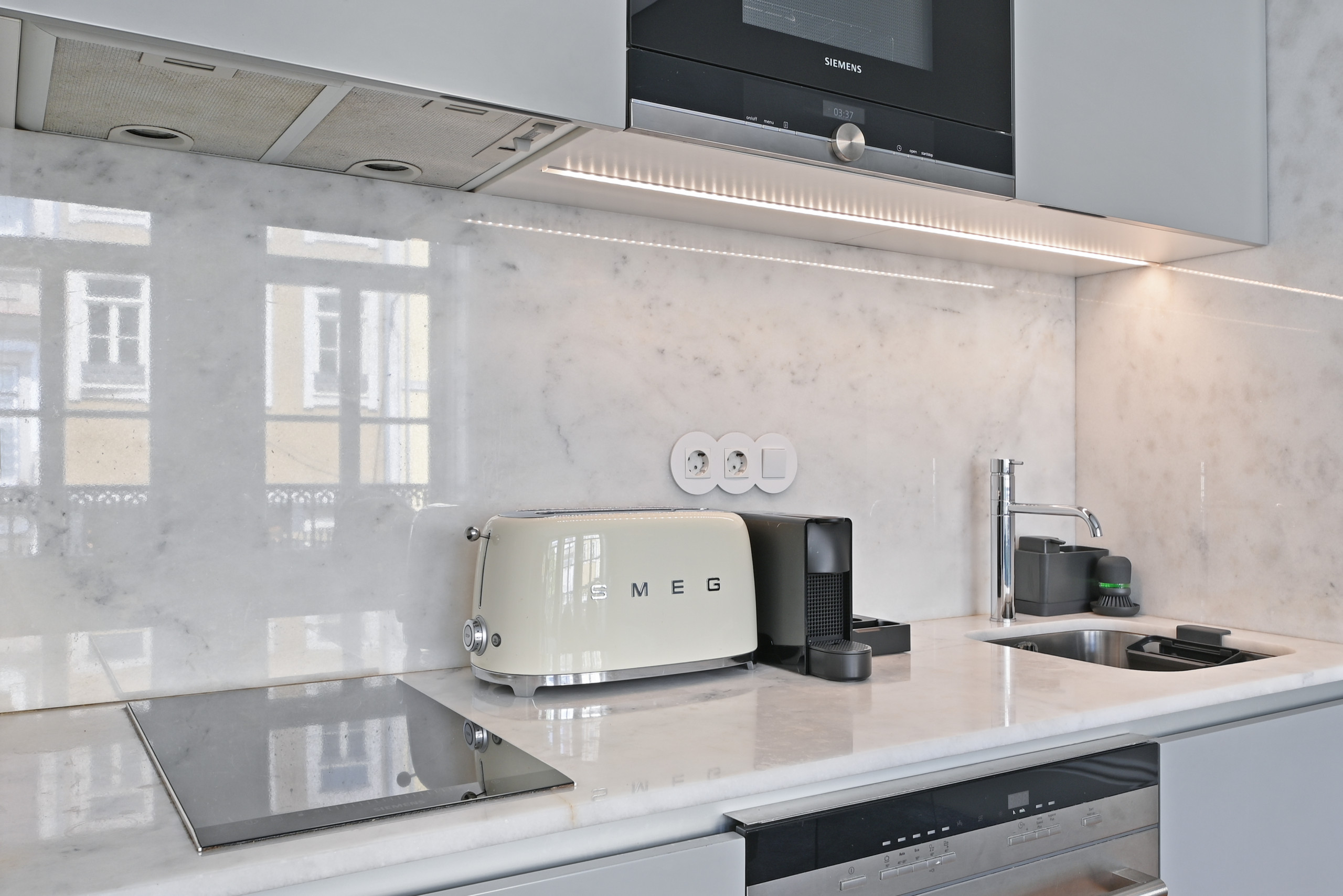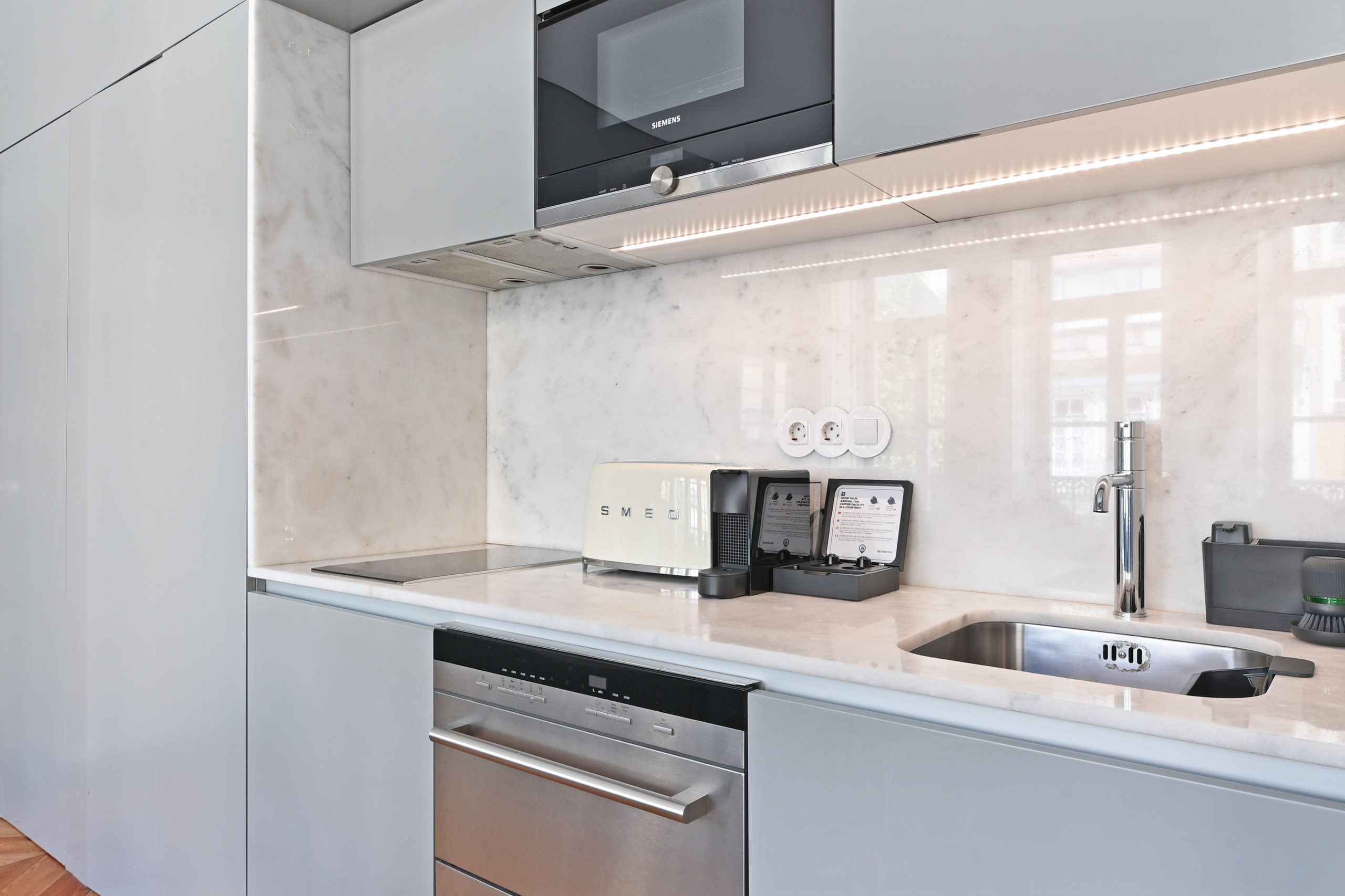 Gourmet Kitchen: Modern kitchenette equipped with SMEG appliances (toaster and kettle) in cream tone, induction hob and built-in microwave.