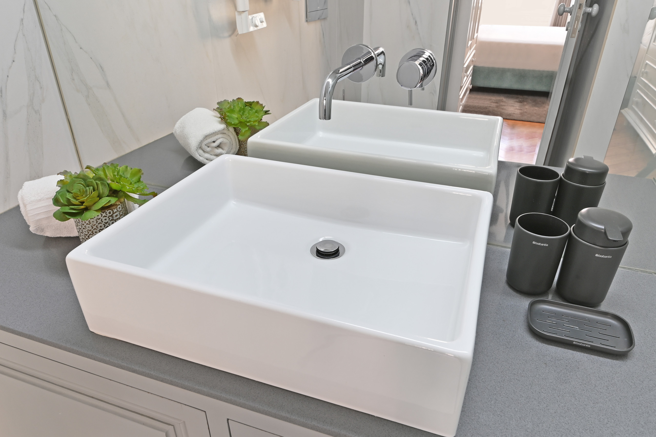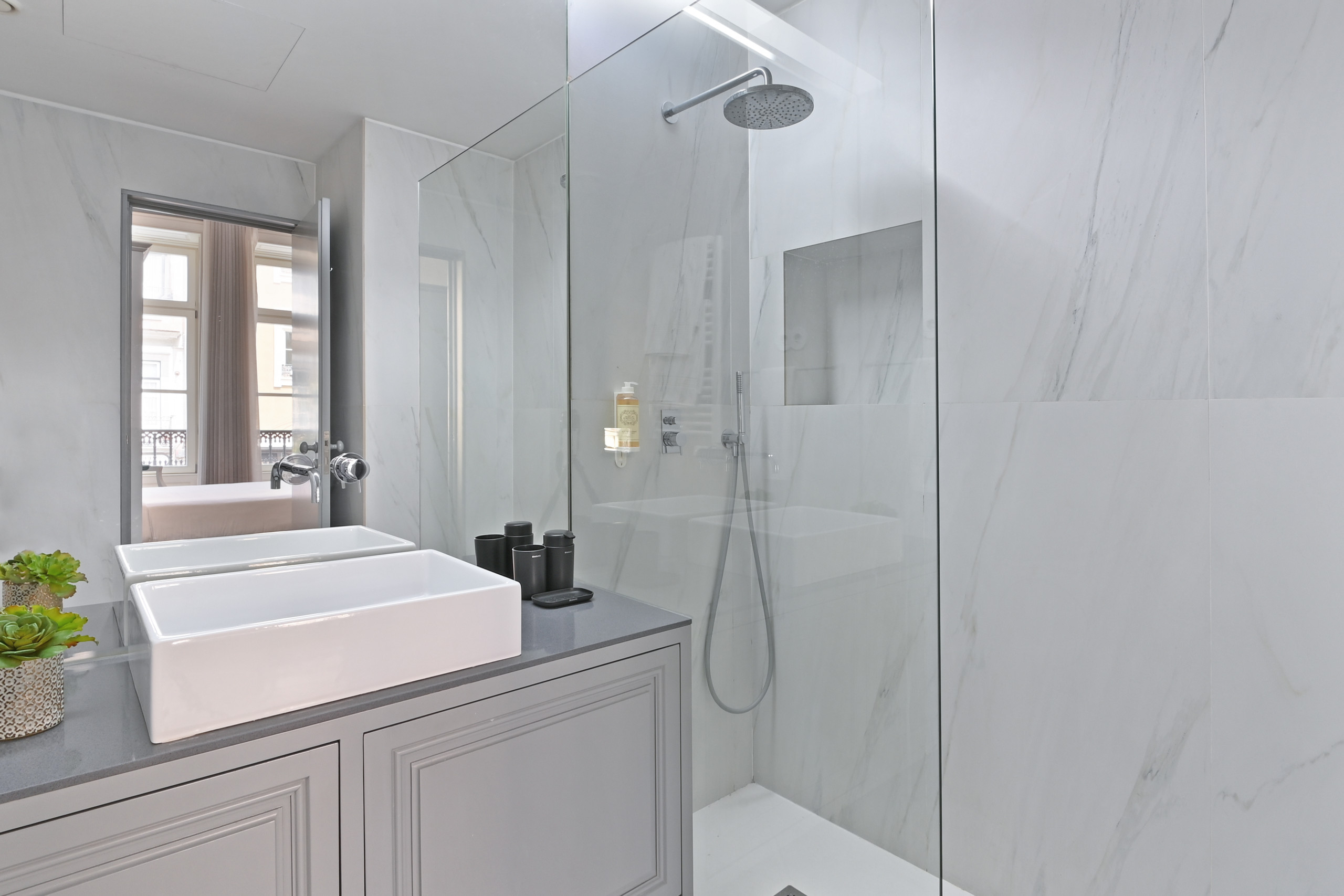 Bathroom: Contemporary design with marble finishes, modern washbasin and spacious shower.