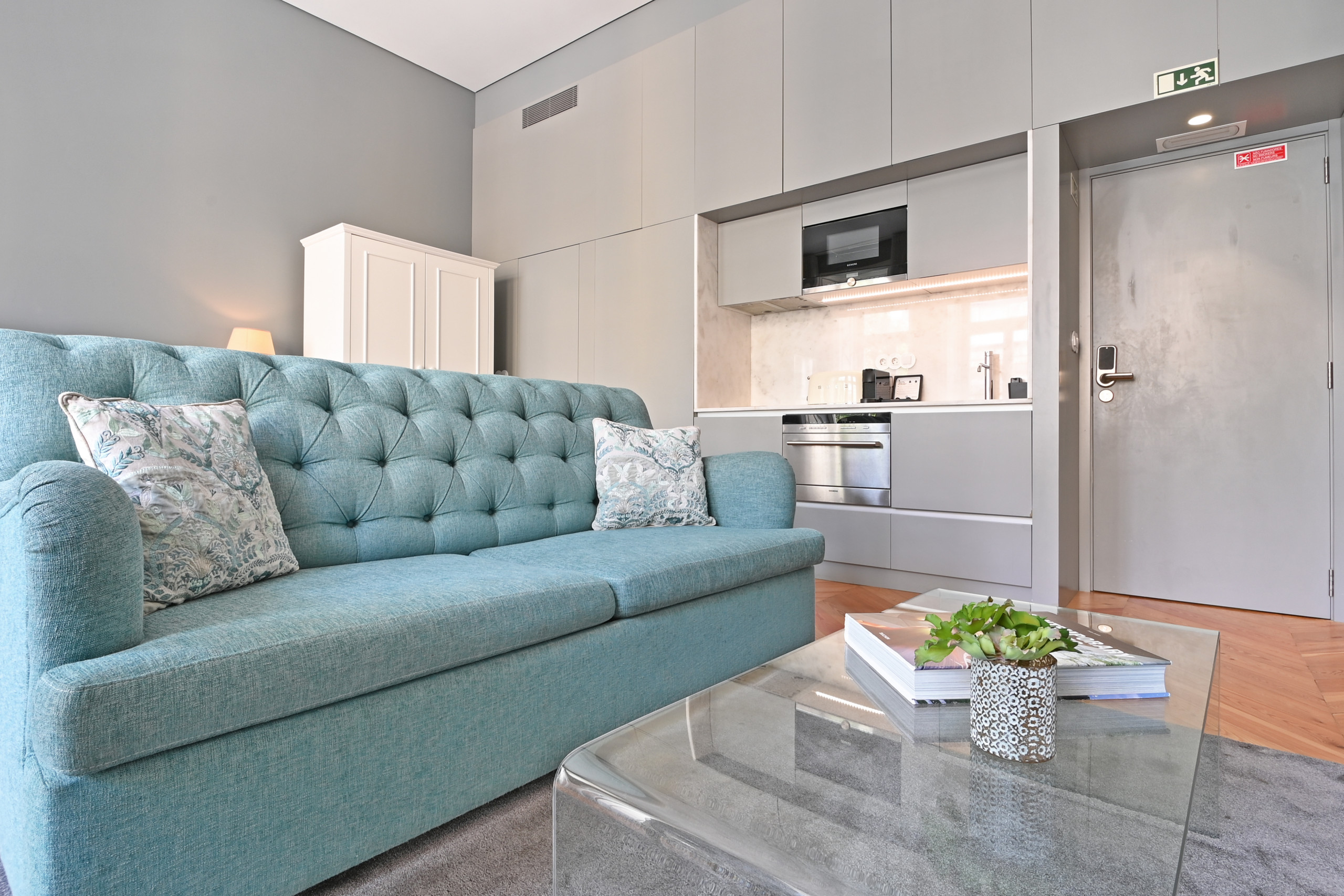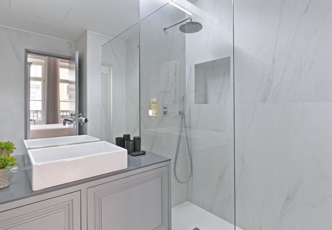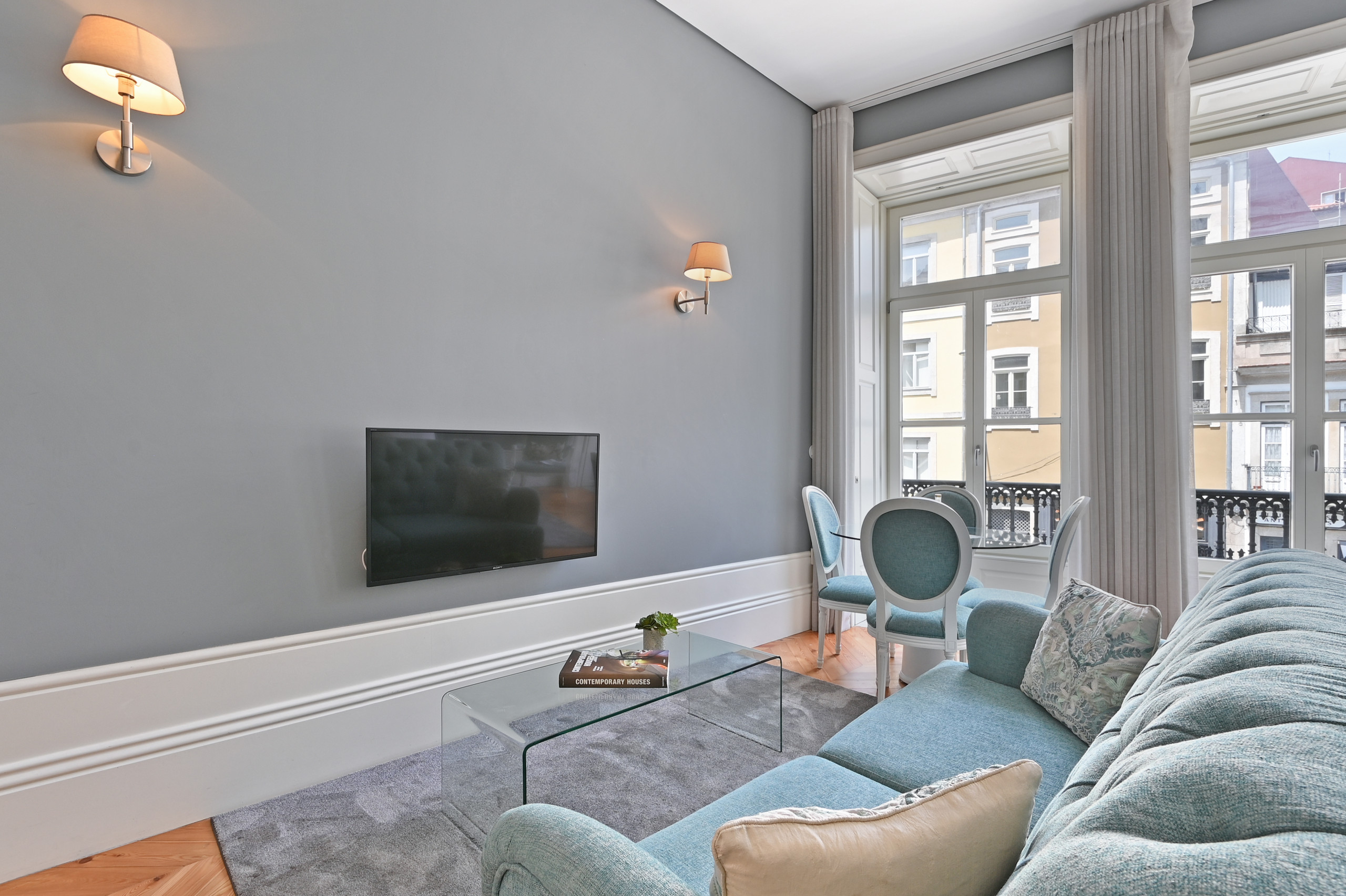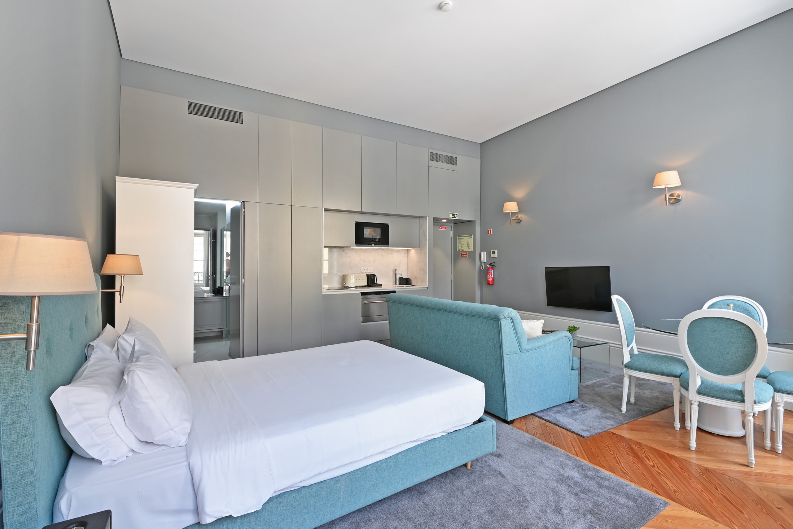 This apartment combines the historic structure of the building with "soft blue" colour accents and a linear, modern design. It is a fresh, bright and sophisticated space, ideal for those seeking personality and comfort in the heart of the city.