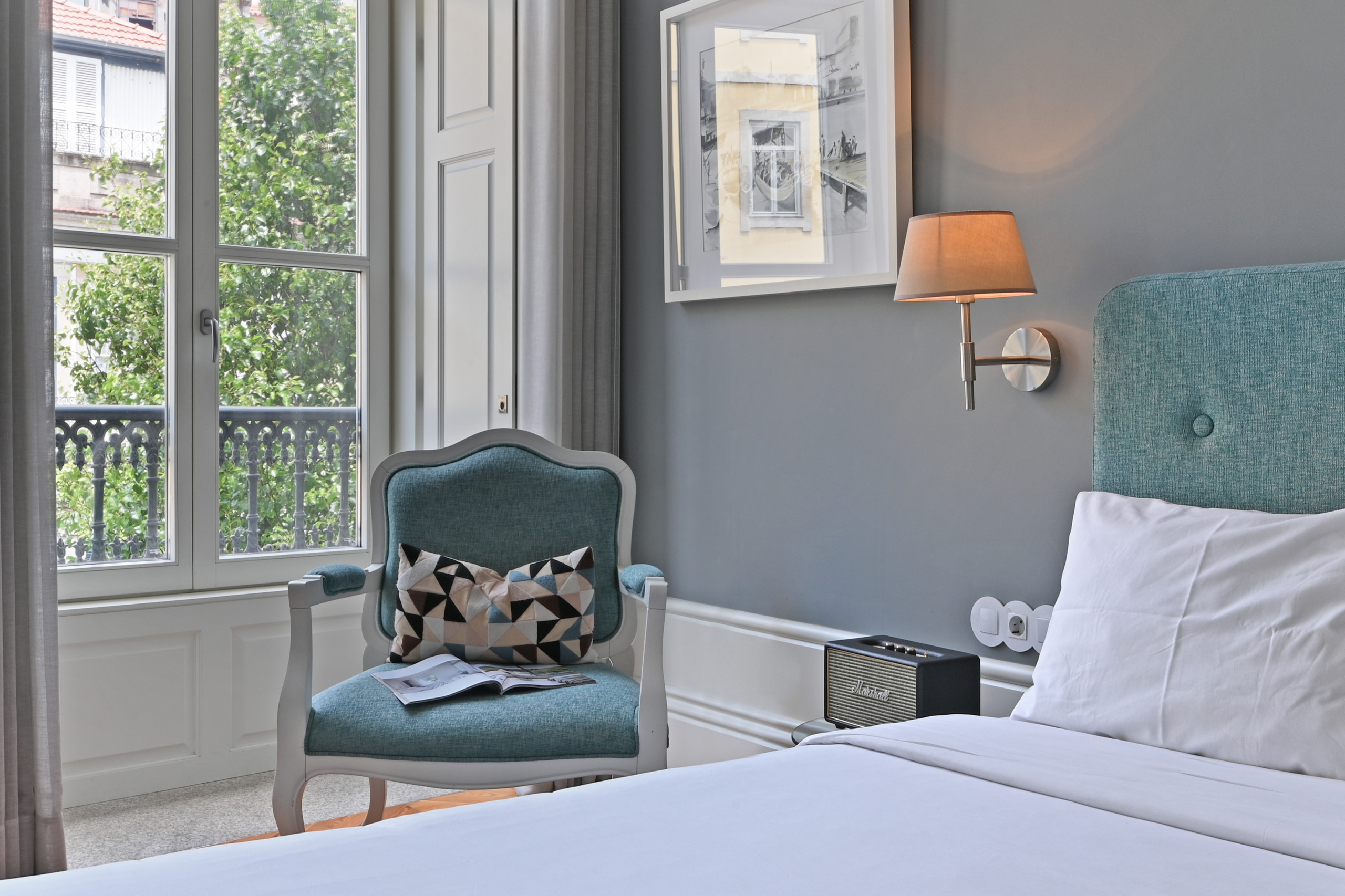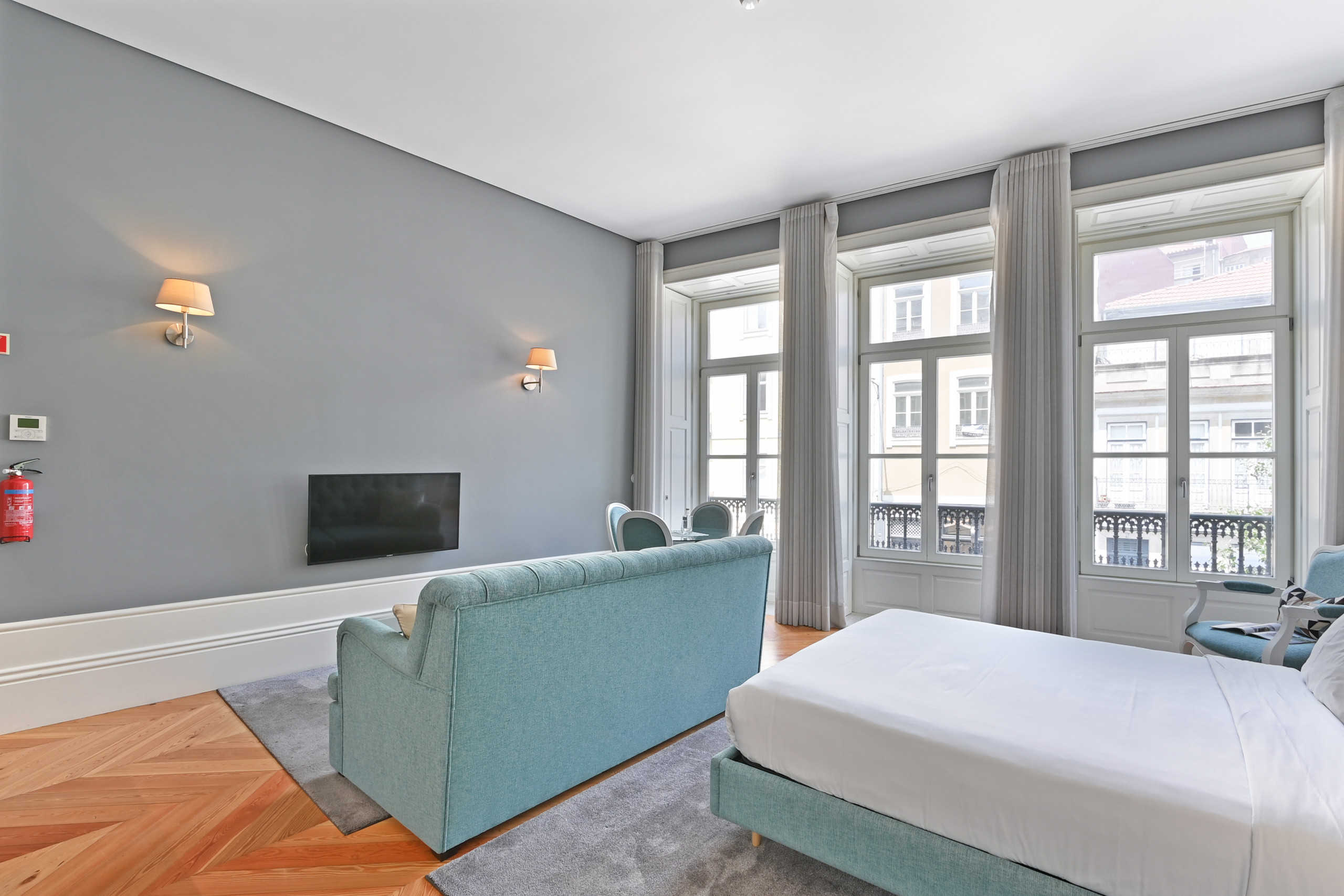 Rest Area: Double bed with headboard in shades of blue, flanked by balcony windows that offer views of the historic street.