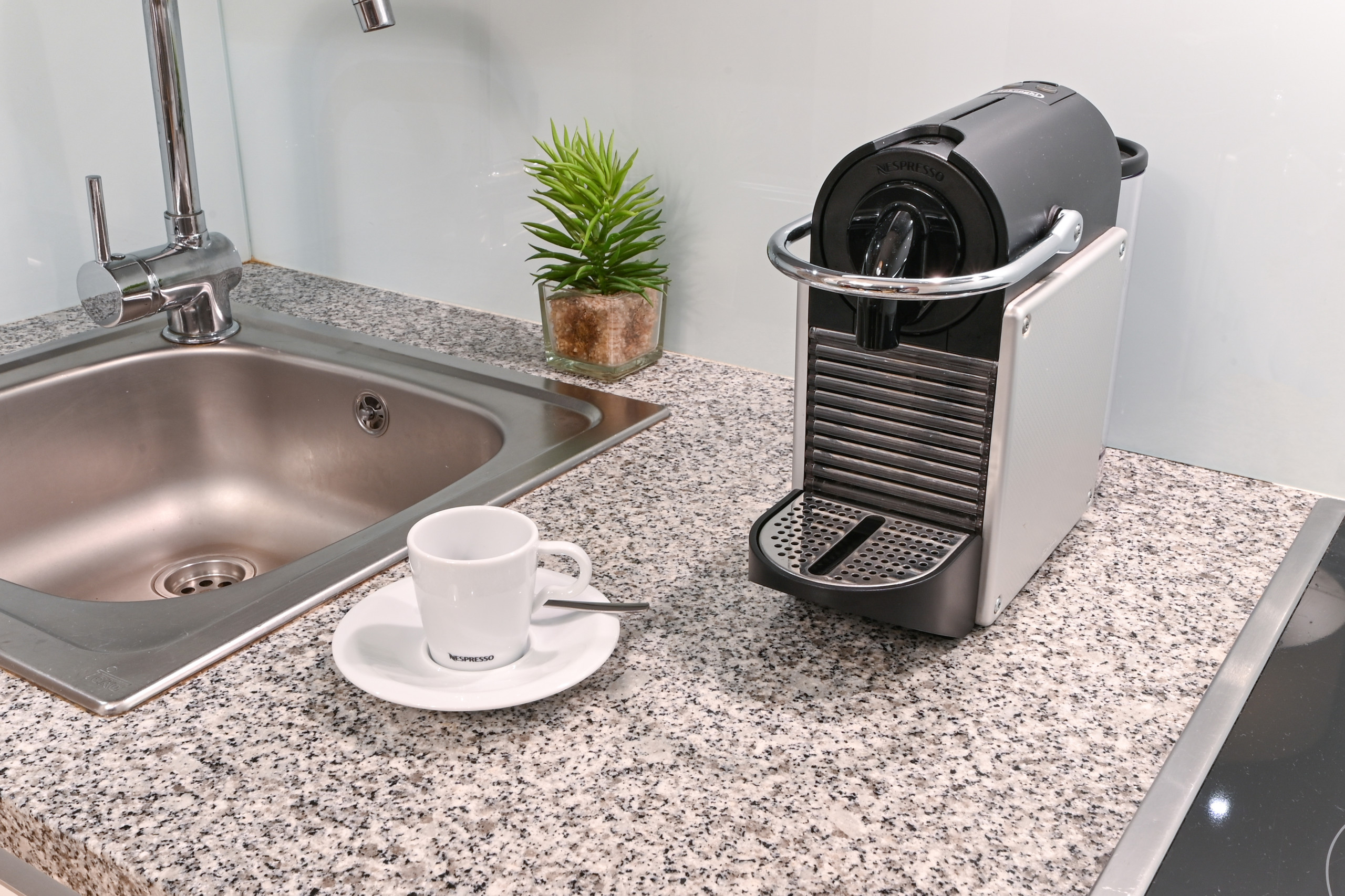 The units feature a fully equipped kitchenette with a fridge, a flat-screen TV with cable channels, and a private bathroom with shower and a hairdryer. A microwave and stovetop are also featured, as well as a coffee machine and a kettle.